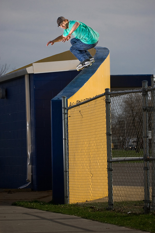 We got some drinks at the gas station and headed north towards the Falls. Dan and I pulled up to an empty parking lot and unloaded the car. Immediately after we hopped the fence and got all my camera gear over, a cop pulled in. I thought for sure he saw us, but apparently not. By this time Dan was hiding from him on the roof, and I was setting up my flashes and scoping out an angle to shoot from. The cop didn’t stay long and after that it was on! I was shocked at how little wax Dan put on this gritty ledge, but that just goes to show Dan’s confidence level. The roof was real soft, according to Dan he could hardly roll on it, but landed the back royale first try anyways. It wasn’t up to his standards, and we shot it a few more times until we both felt the photo came out the way we wanted.