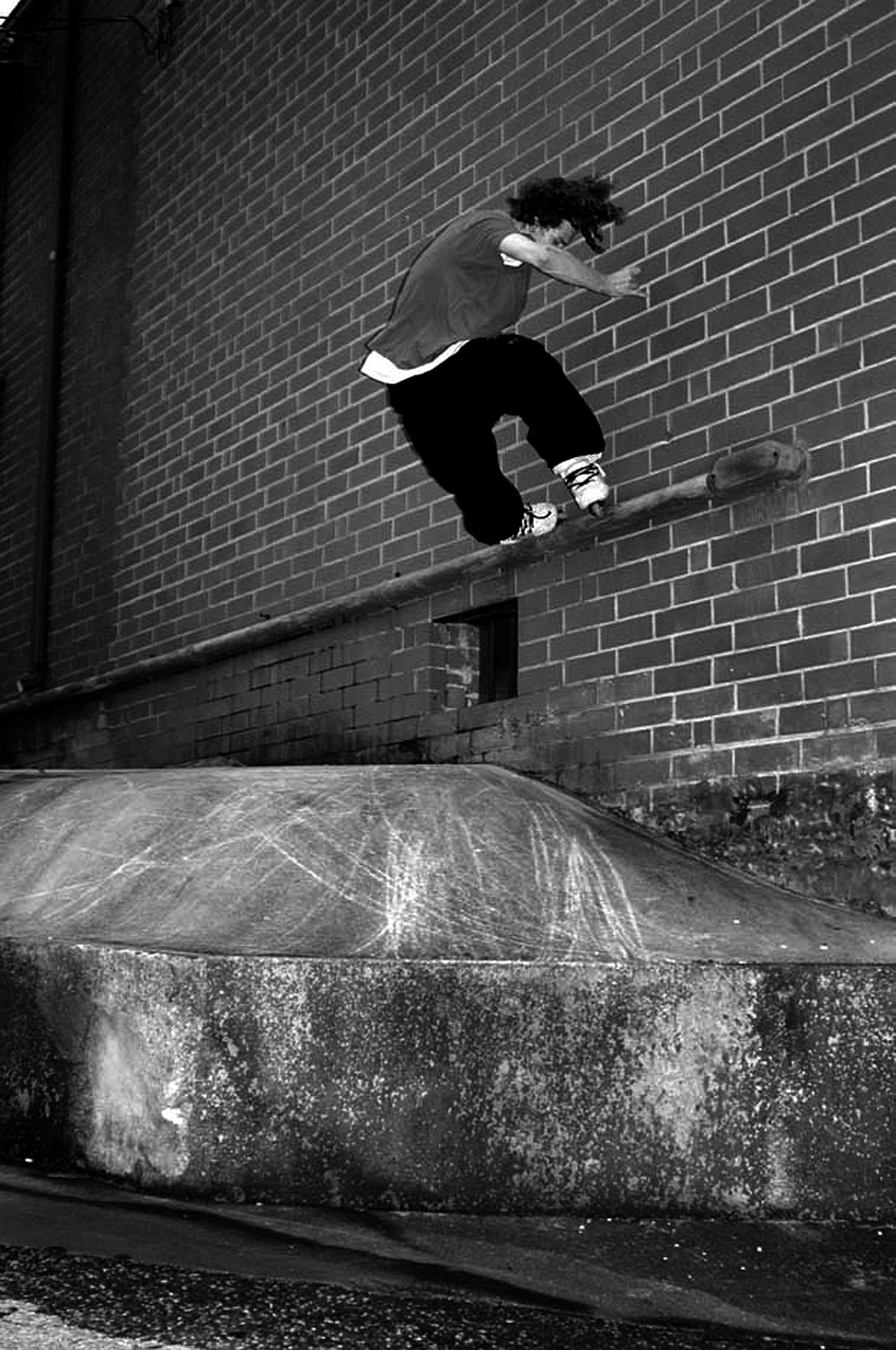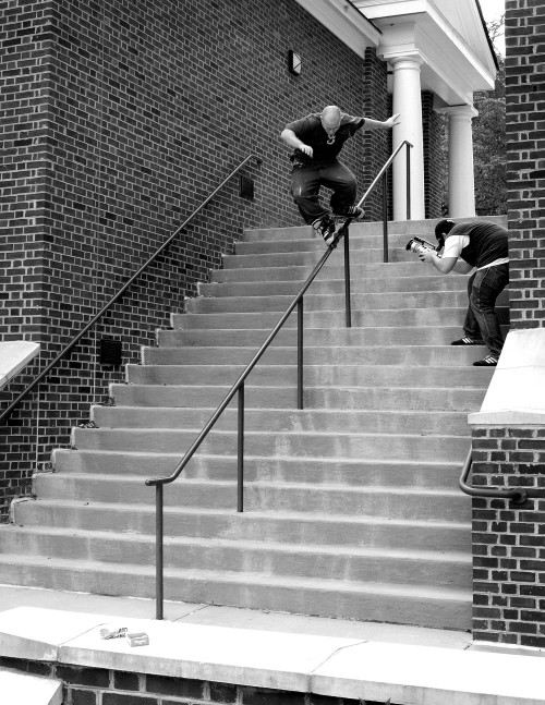 In Greensboro I lived on S. Mendenhall Street right between UNCG and Guilford College. It was fun, and this spot at GC was two minutes away. This rail is fast and comes off right between two walls that I barely show. You gotta hit that hole or your in trouble. Ron Copeland did fakie inspin sweaty for James Reetzke’s camera and rolled away clean in 2002.