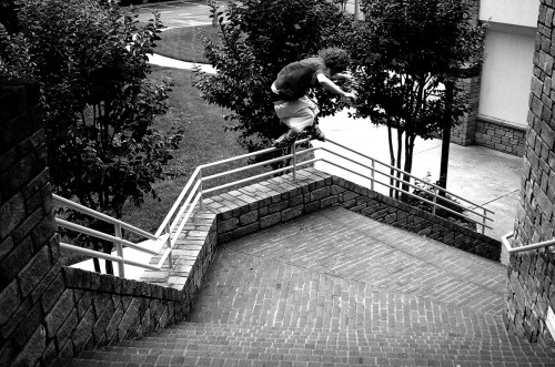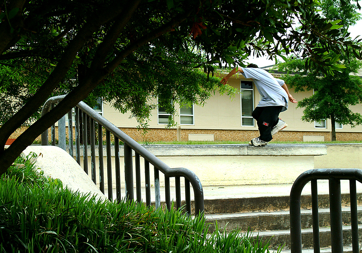 I haven’t seen this picture in years but it could be my favorite that I’ve ever shot. Sure, I could have finessed the framing a bit more and gotten those tree tops in the frame and changed some intersection points, but ultimately I don’t think it matters because this rail had two down kinks and a side kink, and Will still laced this topsoul to fakie. Greensboro, North Carolina 2003.