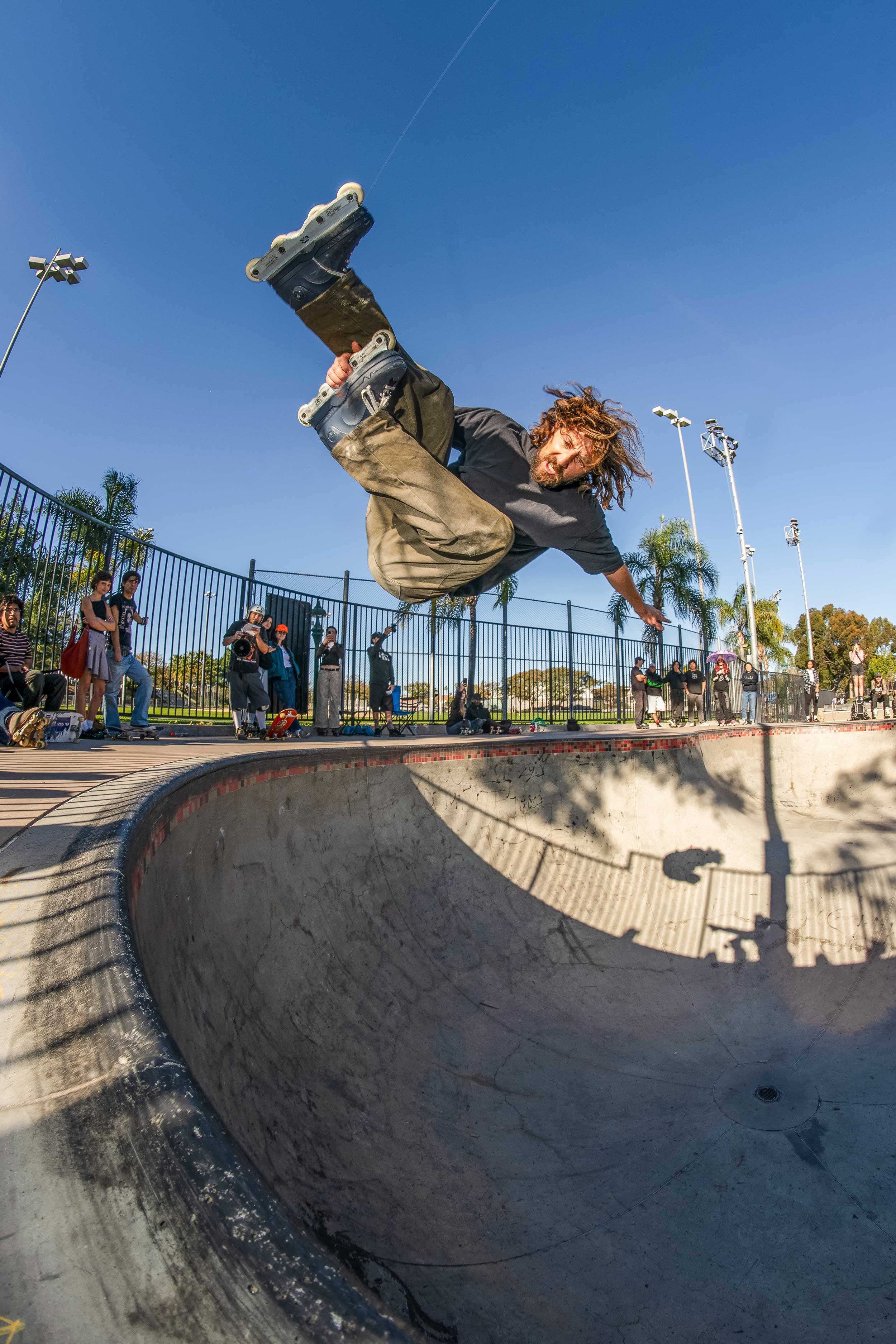 Snowbowl is a quad and inline pool competition held at City Heights Skatepark in San Diego, California. There were nine skaters competing between both quad and inline that travelled from as far as New York and the San Francisco Bay Area and as close as down the street. Our main goal was to bring two communities together, as well as strengthen the community of skaters in the greater San Diego area. We wanted to create a competition that was fun but challenging, hoping to push skaters out of their comfort zones. We noticed a lack of community in San Diego and realized not a lot of events were happening down here, so we thought up Snowbowl — we figure if you want to see a change in your community you have to be the change. If we want our industries and communities to grow, we have to put the effort in to showing up and being present. Although it is a competition, our main goal was to have fun and show everyone that we can support each other’s communities—when one of us wins, we all do. Just the fact that this competition was able to happen so successfully was a win in our books. — Katy Johnson