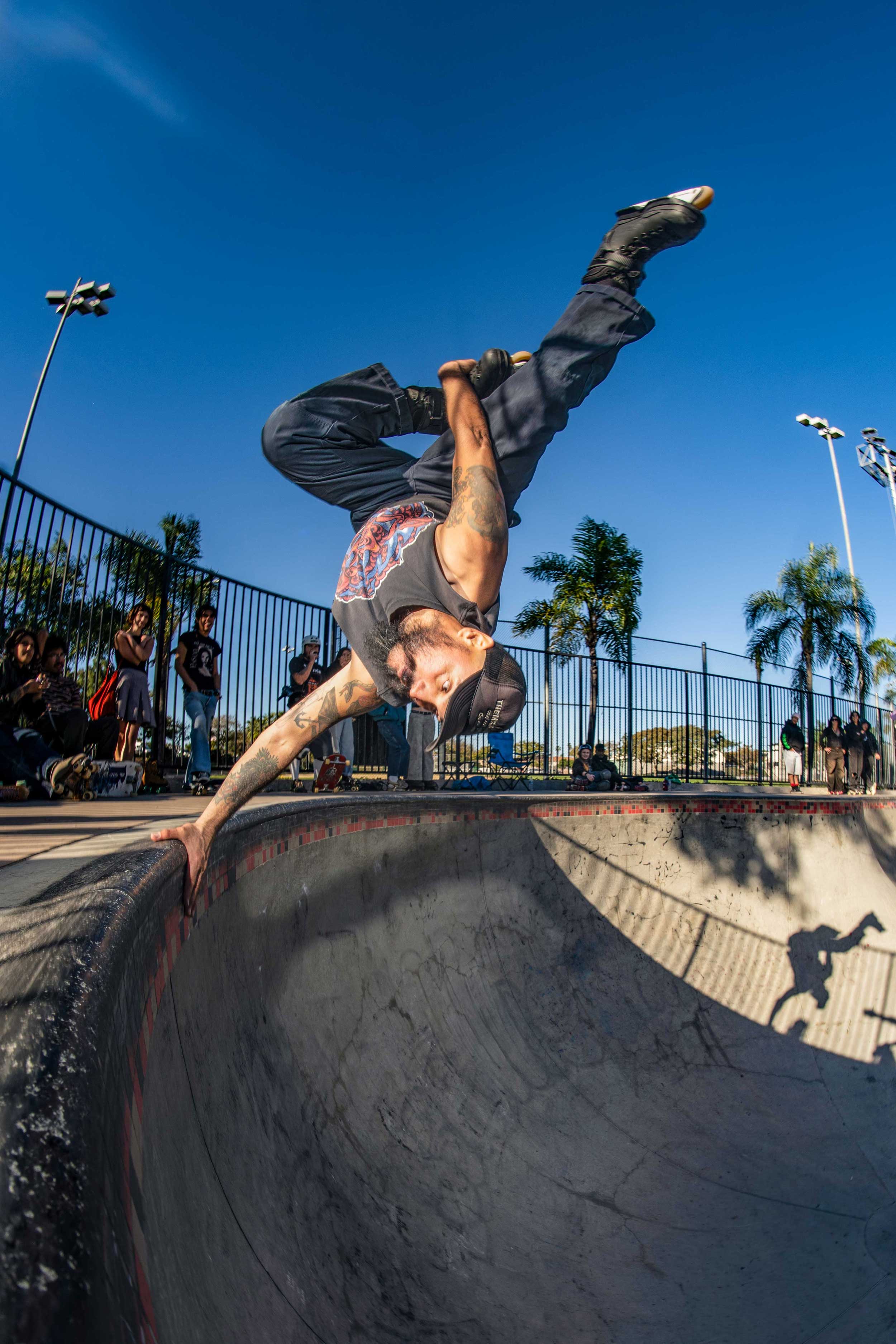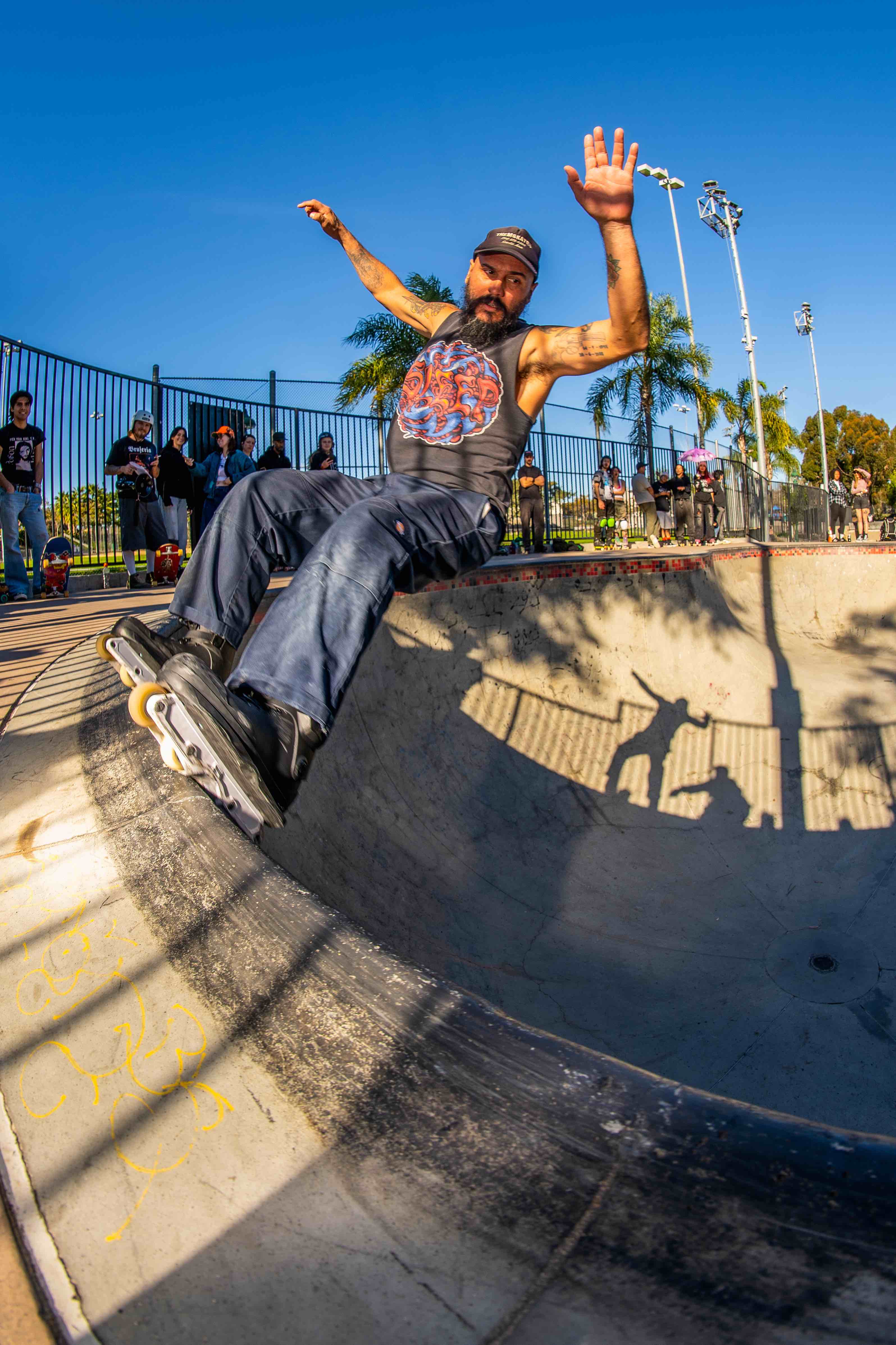 Miguel continued linking lines with confident control, demonstrating his mastery of pumping the curved, traditional pool coping with a clean royale.