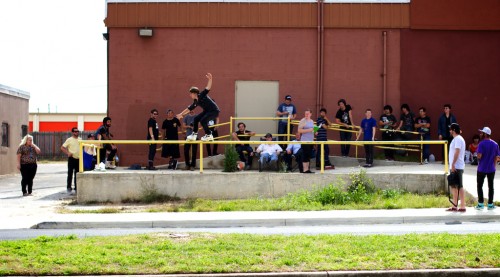 Soon we all headed over to the final spot. It was a ditch containing a rail that went from the flat of the parking lot, down the bank of the ditch, across the flat, then back up the ditch again. I had never seen anything like it, and boy was it intimidating. Will Kennedy also made the announcement that any obstacle in the ditch could be skated. This included not only the rail but a few raw gaps and up-ledges as well. There was a slight division of skating at the last spot because of this. Some people owned the gaps such as Josh Ferguson, Andrew Broom, Caleb Benavides, and especially Timona “T.K.” Kasue — who wasn’t even competing in the event, but when I offered him ten dollars to gap from basically a bridge into a tiny steep bank he was immediately about it. He gapped into the bank with a grin on his face and snatched the money out of my hand as he rolled away. At the other end of the ditch things were getting serious on the rail. Travis Reynolds and Logan Harlan were able to make it all the way across, down, across, back up the rail and land into the bank, rather than the grass. Others were sticking to laying hammers on the across and down sections of the rails. Jarrod Banning was able to lace a backside savannah across the flat then down and across some of the flat again which had people going nuts. Ian Freunscht got buck as hell with a frontside torque to topsoul 540 out. Most of all Dylan Cobb was spittin’ hot fire with numerous tricks. What stuck out to me the most was his truespin topsoyale across and down the rail and his pornstar to truespin topside pornstar across and down the rail. That kid was dropping so many hammers it really is hard to remember them all. There was no time limit at the last spot so over time it ended up being a few people still going at it. When we lost count how many tricks Dylan and Jarrod had done we knew we had our winners.