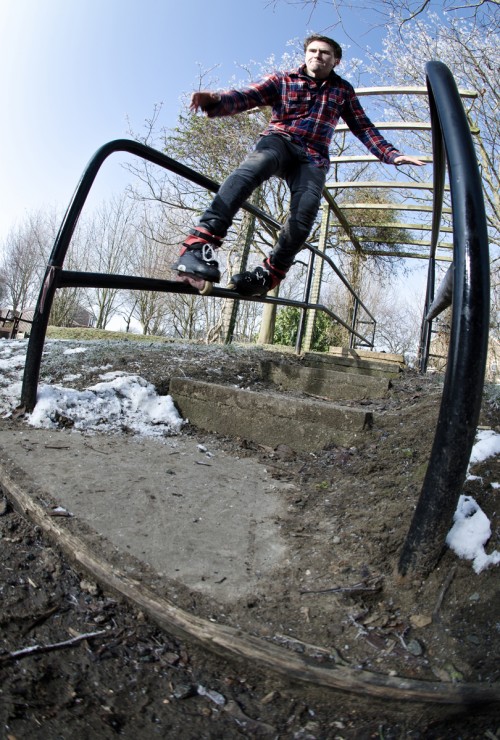 With the temperature only just creeping above 0ยบ and the UK in the grips of nationwide snow storms, Adam and I still set out for a skate at the marble city of Milton Keynes. But before heading there we headed to a local spot to film a trick of Adam’s. Problem was, I liked the trick Adam decided on so much that I just had to get a shot of it as well. So, in freezing cold temperatures, Adam laced a switch Topsoul on the lower right rail to transfer over to natural Topsoul on the lower not once… but four times! Not bad for first spot of the day. I captured the trick with my 10mm fisheye and lit up Adam using one Canon 540EZ at 1/4th to the right and another Canon 540EZ at 1/8th power to the left.