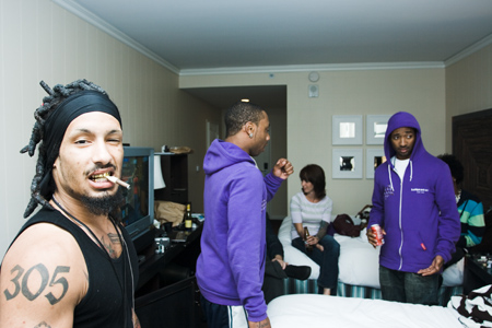 ONE caught up with B Unique team members Franky Morales, Ramelle Knight, Sam Williams, and the Brown Brothers this past weekend in San Diego while they toured with the Mountain Dew Ball4Real street ball tour. The guys have been on hand for several stops, and have about 27 more cities to go, performing “freestyle rolling” demos for unsuspecting b-ball crowds. Here’s a look at some pre-party action at the Hotel Salomar before venturing out into the night. Be on the lookout for the tour when it comes to your town this summer.