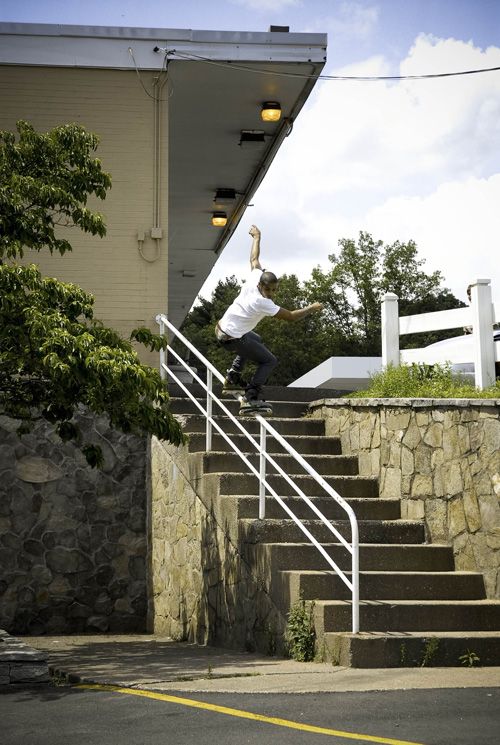 Late that night we arrived in Rhode Island and went to meet up with Zack Boozer at some party. When we got to the party there was a mom and a bunch of dudes with blow outs and popped collars. Needless to say we left immediately and headed to the apartment of local skater Dennis Hollis. Denis owns the best bull dog / chameleon I have ever seen. That night Zach hooked it up with a place to sleep and a fridge to raid at 2:00 am. The next morning we went to Jeff Dalnas’ to meet up with everyone and head to some spots around the area. With a massive caravan of skaters we hit up a pretty sweet low yellow rail, tollgate high, and the blue ledges in providence. The session reminded me of the old times, before cell phones, when huge groups of kids would all go meet up at one set spot.