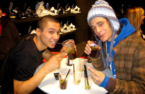 ONE made it to Germany in time to check out the Winter ISPO show in Munich before heading up north for Winterclash. ISPO may not be as big for rolling as it used to be (only Valo, The Conference and Ucon have booths), but there are still plenty of ski and snowboard vendors handing out free drinks. Here we’ve got Benny Harmanus and Jochen Smuda enjoying their complimentary cocktails at the Flow Snowboarding booth. Good times for sure.