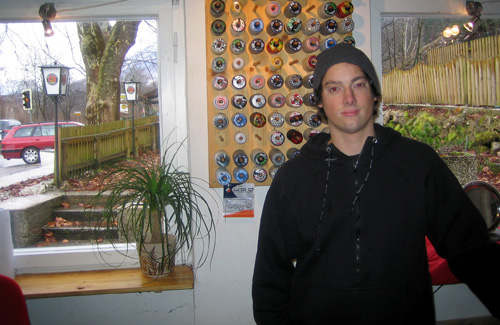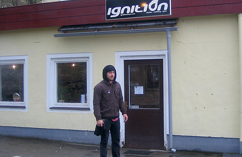Later Friday night the Rat Tail guys showed up, powering through a 9-hour drive from Frankfurt in a snow storm. Saturday morning we all headed over to the skatepark and shop for a demo and to meet the local bladers. Before lacing up his Nimhs to shred the park, a chilly Jon Elliott headed into Ignition to check out the shop.