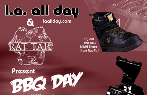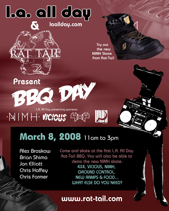 This Saturday the guys at Rat Tail are getting together with L.A. All Day to have a BBQ at the Santa Monica Boys & Girls Club Skatepark. Show up for some free eats, and to session with the likes of Chris Farmer, Alex Broskow, Jon Elliott, Brian Shima and Chris Haffey. You’ll also have the chance to test out some Nimhs… if you haven’t already. Be here from 11 to 3 Saturday, March 8th.