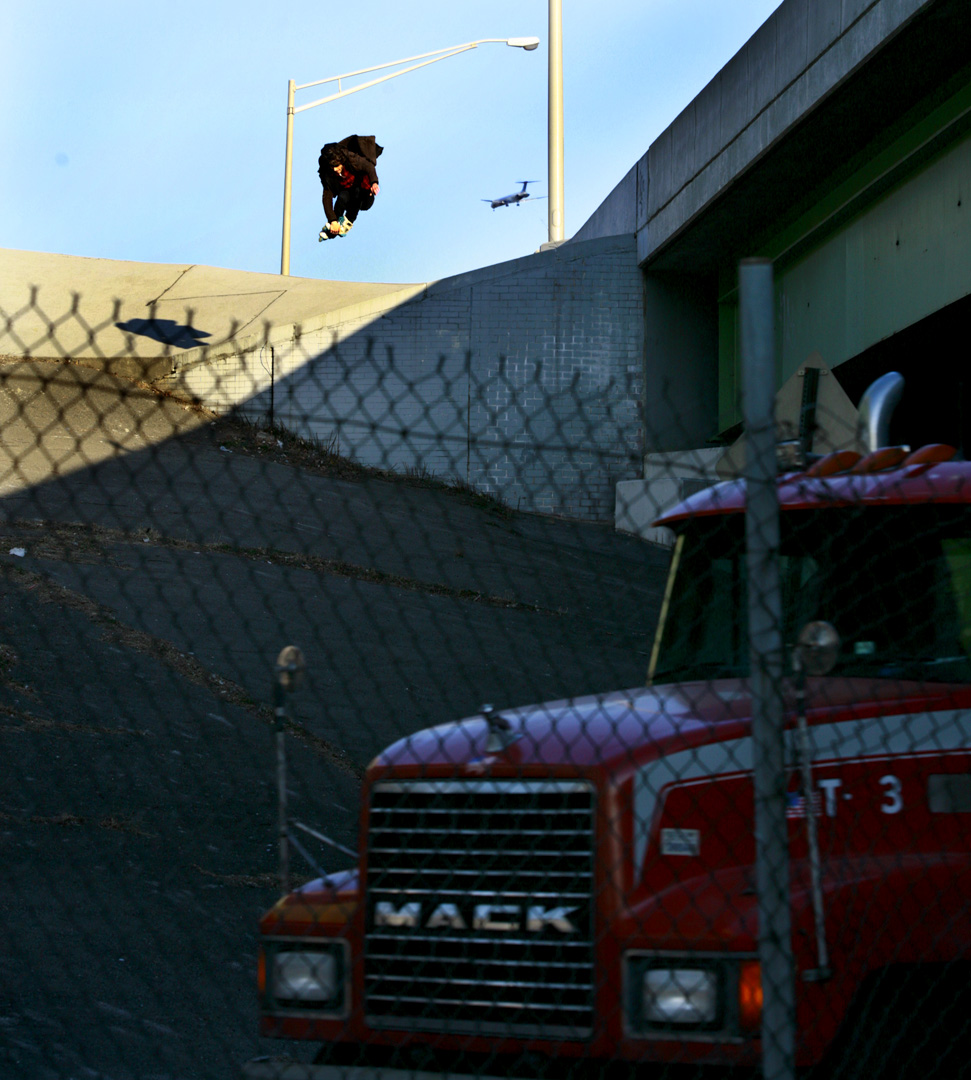 While taking the shot I never would have guessed that this shot would be so complex in its final stage. Somewhere between the speeding Mack truck and the airplane flying alongside Dave, we managed to pull one of my favorite shots of this year, and for Dave the experiance was great. He loved the feeling of airing into such an intense downslope, and he did more than eight gaps while landing seven of them, each time jumping higher and higher. I’m glad to have somone willing to fly so many times, because I was able to film the picture and create a mini edit of the trick. Keep a eye out for a Dave Lang profile in our next issue, that’s Art of Rolling Magazine 7, to see a extensive, in-depth look into the life of Dave, and witness the hammers he’s throwing down in NYC. — Angelo Ferrer