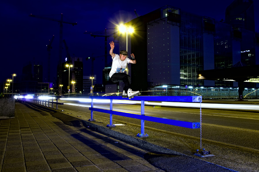 Gerben Kuiper spotted this rail a long time ago, and ever since he’s been bragging about how many grinds he’d be able to pull on it. In his mind he thought he could use the little bump to get more air. In reality it was not like that. The so-called mini-bank ended up being more of an obstacle and, to make things worse, the square rail is next to speeding traffic. Not really an ideal skate spot. But for a photo it is perfect! After several attempts with a shin as blue as the rail, Gerben souled it from bank to bank. I used two flashes (left and front) to capture the fast movement of the skater and I opened the shutter for one second to capture the speeding traffic. The flashes went off right before the shutter closed. You can find this rail above the train platforms at Central Station in The Hague. (technical data: 17mm, 1 sec, F6,3, 200 iso) — Thomas Vahe