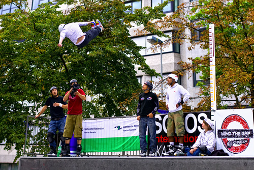 The finals of the European Halfpipe Championship were held the second weekend of September. This event takes place in Mallorca, Montana, and Rotterdam; all European cities. Particpants are from all around the globe, among them big names like Fabiola da Silva and Eito Yasutoko. As to be expected the level of skating was phenomenal. Nowdays all the vert pros do their tricks in “double-mode.” Double backflip, double flatspin, double-anything! I also saw some complicated grind combinations, and of course the original crazy spins from mister Yasutoko. Marco de Santi from Brazil performed a perfect run, with loads of air time and hard spins high above the coping. This capture of a Cross Rocket Air was one the many tricks he pulled to impress the judges and win the whole event. (Technical data: 50mm, F2.2, 1/1600, 200 iso) — Thomas Vahe