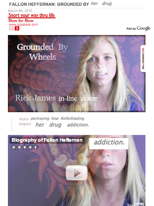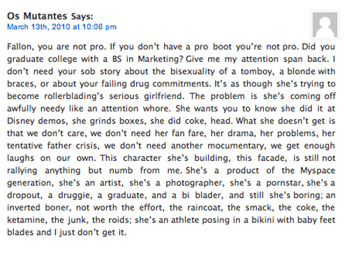 It turns out our most controversial icon in the sport turns out to be a real true fruitbooter, and a girl at that. I guess we can all put our leather jackets and cowboy hats on the hook. What’s the point in trying when someone is so willing to bare their soul on the internet. You hate to love it? I don’t think hate or love capture my feelings about Fallon Heffernan. The things she says speak louder than her action sport addiction. All week she’s gotten a slew of honest hate and admiration on forums. She became the epicenter of two of three main pages in blading. Thanks, Fallon, for being so interestingly mediocre. Just kidding. Isn’t everyone? Over in the critic’s corner you might think differently with a slew of remarkable 188 blink and make you think comments spewing verbal sewage for the world to see and shit themselves. What’s painful is that she sunk to their lower level and attempted to respond with dignity. Unfortunately, when you drop a hammer first trick, you can’t bring anything but bangers the rest of your run. What’ll happen next? I’m on the edge of my seat and shaking in my fruitboots awaiting the next real life snippet. Until then these trolls stabbed her insincerity and pretty much summed up the general feeling of all the hate comments. But don’t worry, those sorts of swine won’t even use their real names.
