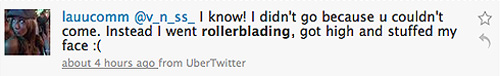 There are good-looking girls always Twittering about rollerblading. Take for instance Ms. Lauucomm: