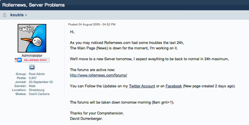No Rollernews? What’s a Web-scouring blading news whore supposed to do? Damn you, technological upgrades and your impingement on everything skating!